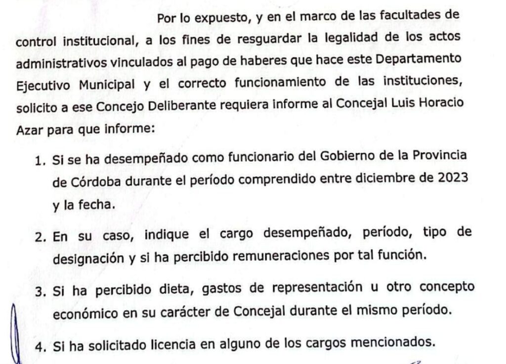 El eje del conflicto gira en torno a una presunta incompatibilidad de funciones: Azar estaría ejerciendo de manera simultánea dos cargos rentados, una situación expresamente vedada por la legislación vigente. El tema tomó estado público tras una publicación del VOX, que encendió las alarmas dentro del escenario político local y provincial.